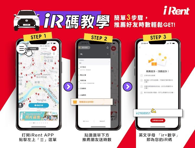 A2:打開iRent App > 點擊左上角【≡】選單 >點選選單最下方【推薦朋友送時數】> 複製ir碼(英文字母「ir+數字」即為您的ir碼)。