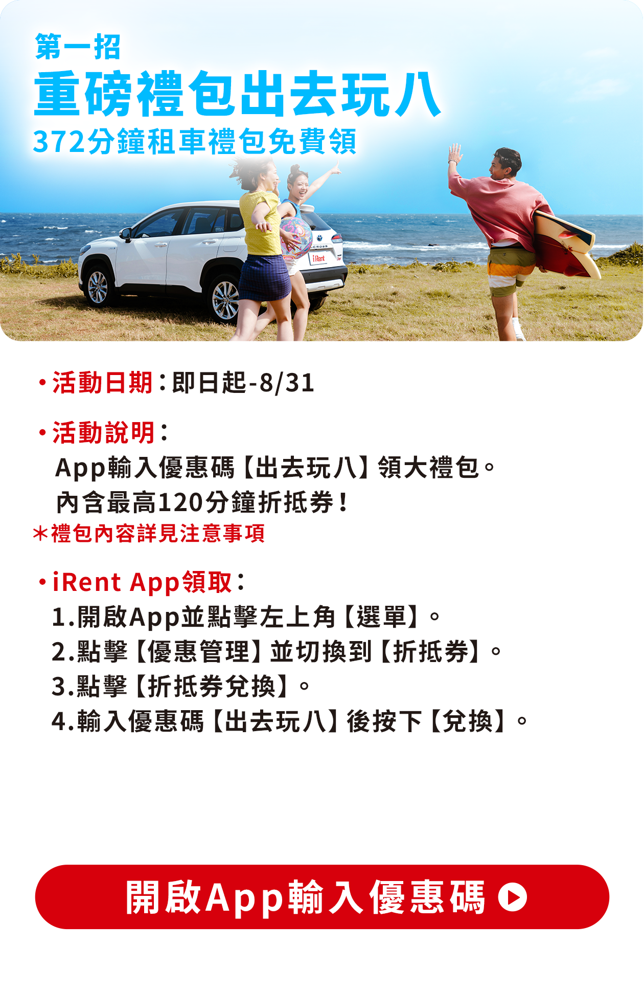 【行動包廂】「宜蘭包棟住宿券」x1張 +「iRent 汽車一日(10小時)折抵券」x1張 *連續租10-24小時皆以10小時計 |