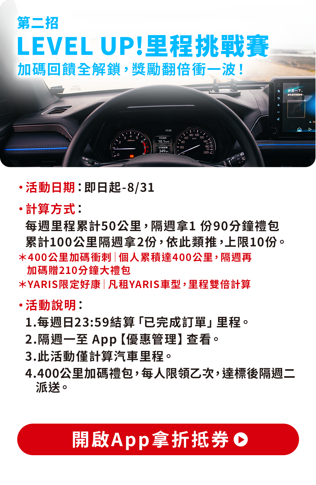 範例一:會員A在 8/4(一)~8/10(日) 之間累積了 120 公里,將在 8/11(一) 收到 2 份禮包,發放至 iRent App「優惠管理」中的折抵券。