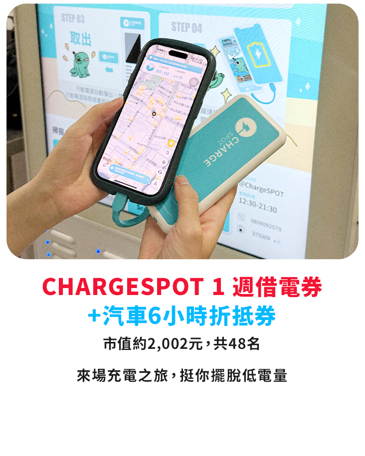 【社畜充電】「ChargeSPOT 1 週借電券(內含 7 張1日免費借電券,獲券後 30 天內可用)」x1份 +「iRent 汽車6小時折抵券」x1張 |