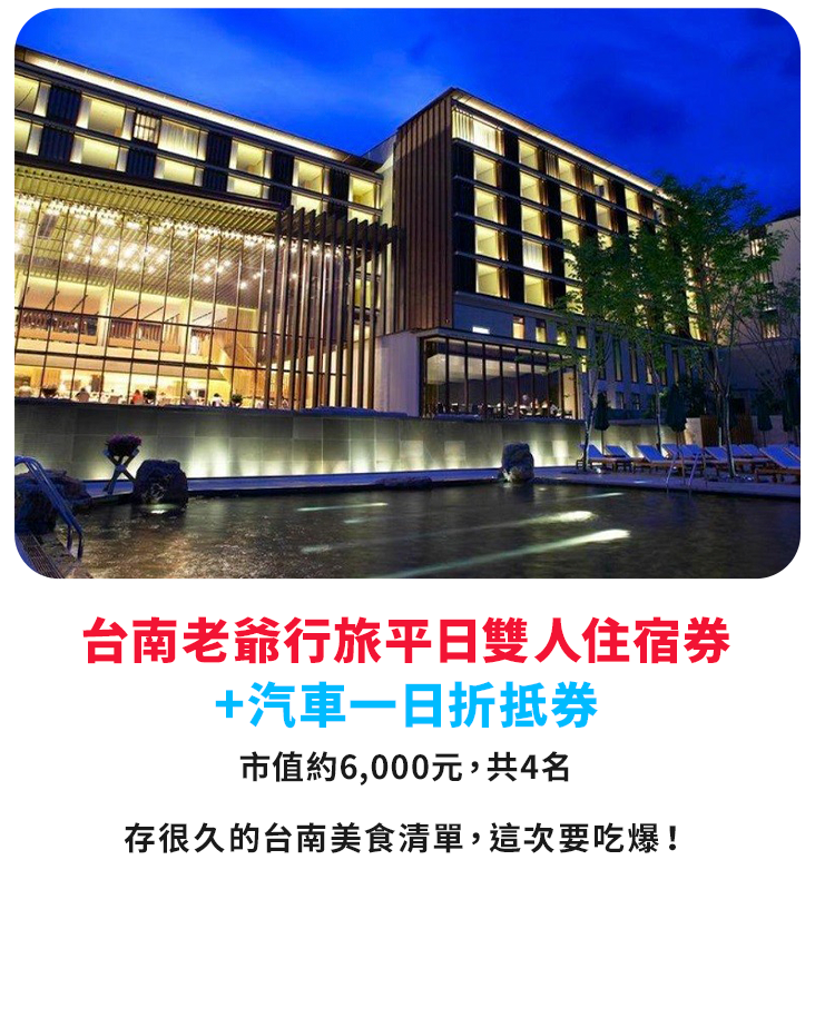 「老爺酒店聯合住宿券(台南老爺行旅平日雙人住宿券)」x1組 +「iRent汽車一日(10小時) 折抵券」x1張
