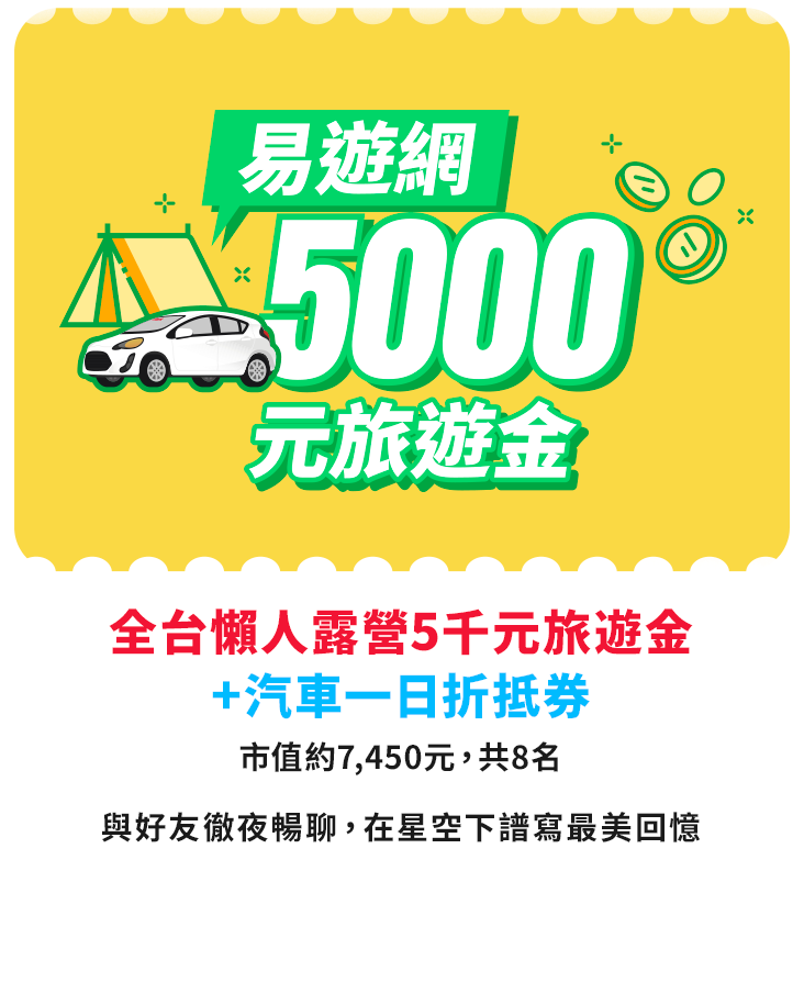 【療癒星空】「易遊網全台懶人露營5千元禮券」+「iRent 汽車一日(10小時)折抵券」x1張 *連續租10-24小時皆以10小時計。 |