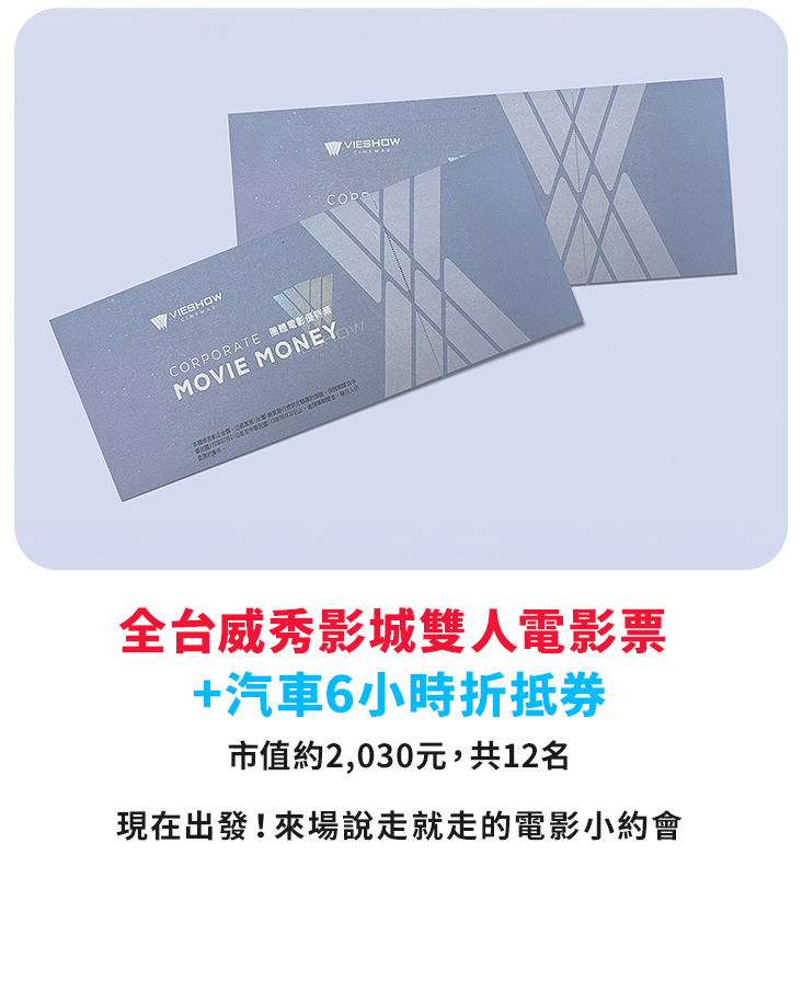 【約會曖昧】「全台威秀影城雙人電影票」x1組 +「iRent汽車6小時折抵券」x1張 |